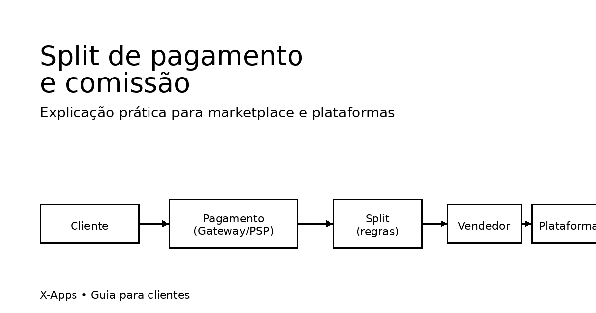 Split de pagamento é a capacidade de dividir automaticamente o valor de uma compra entre dois ou mais recebedores (por exemplo: vendedor e plataforma), com base em regras pré-definidas.