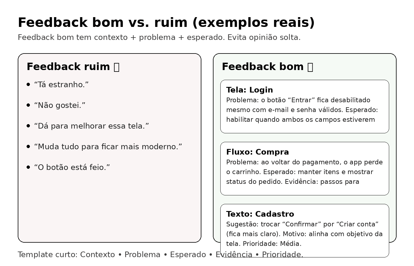 - Exemplos de feedback bom vs ruim