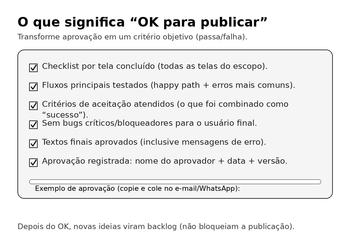 “OK para publicar” precisa ser uma regra objetiva, do tipo passa/falha. Não precisa ser perfeito — precisa estar “suficientemente bom” para ir ao ar com segurança.