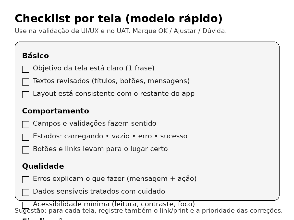 Passo 2 — Validar cada tela com um checklist (objetivo > opinião)
