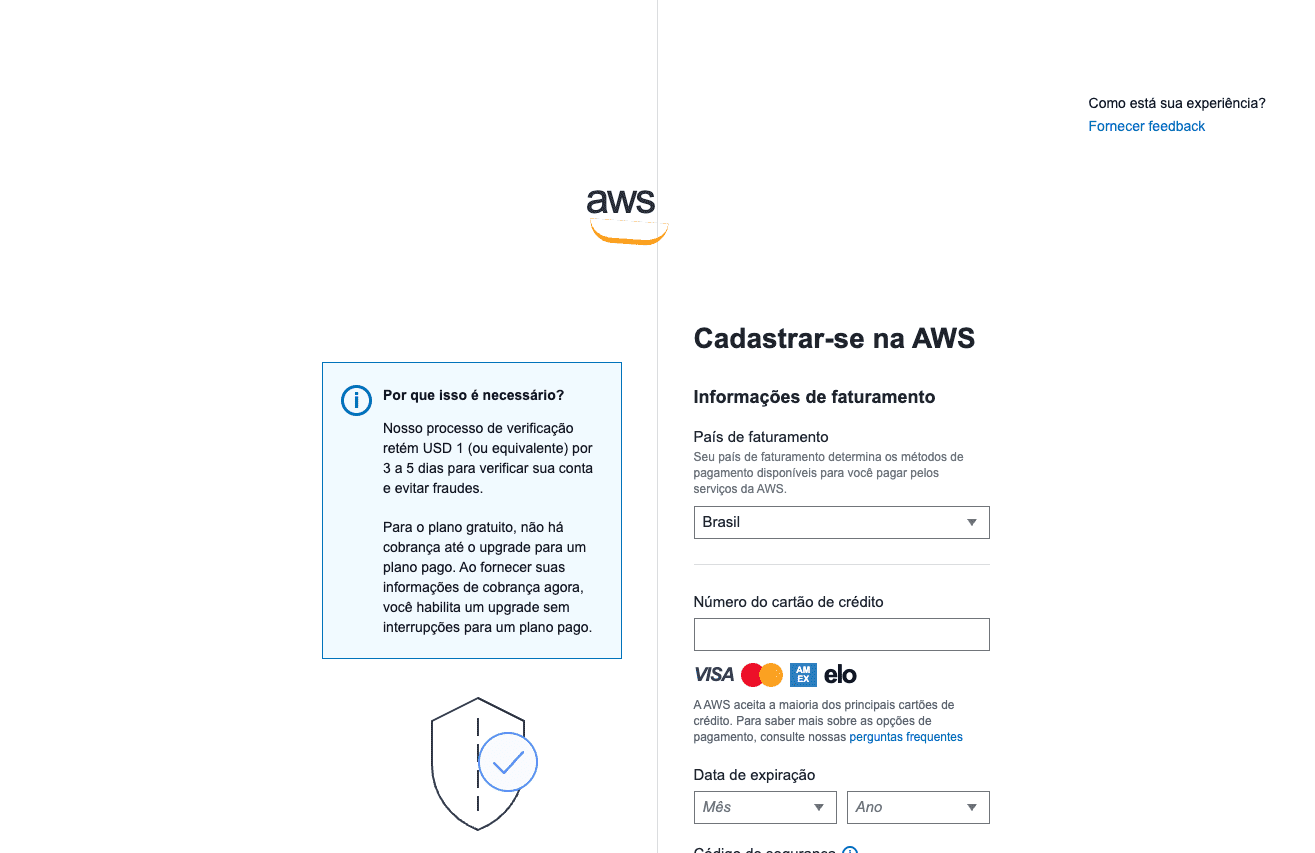 Preencha os dados do cartão diretamente na página da AWS e conclua a verificação. A AWS pode fazer uma retenção pequena e temporária para confirmar o cartão, conforme as regras de verificação do próprio provedor.