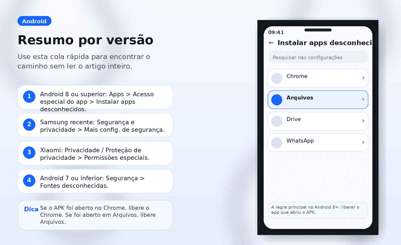 - no Android 8 ou superior, a permissão costuma ser dada para cada app que instala o APK, como Chrome, Arquivos, Drive ou Meus Arquivos;