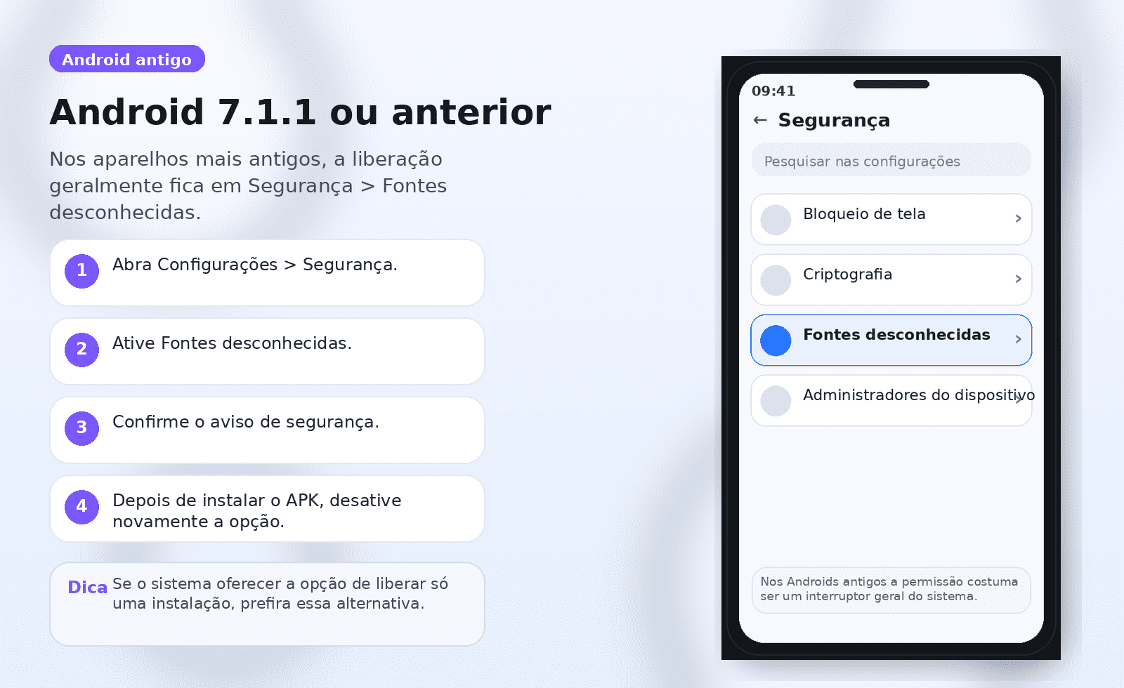 | Android 7.1.1 ou anterior | Configurações > Segurança > Fontes desconhecidas |
