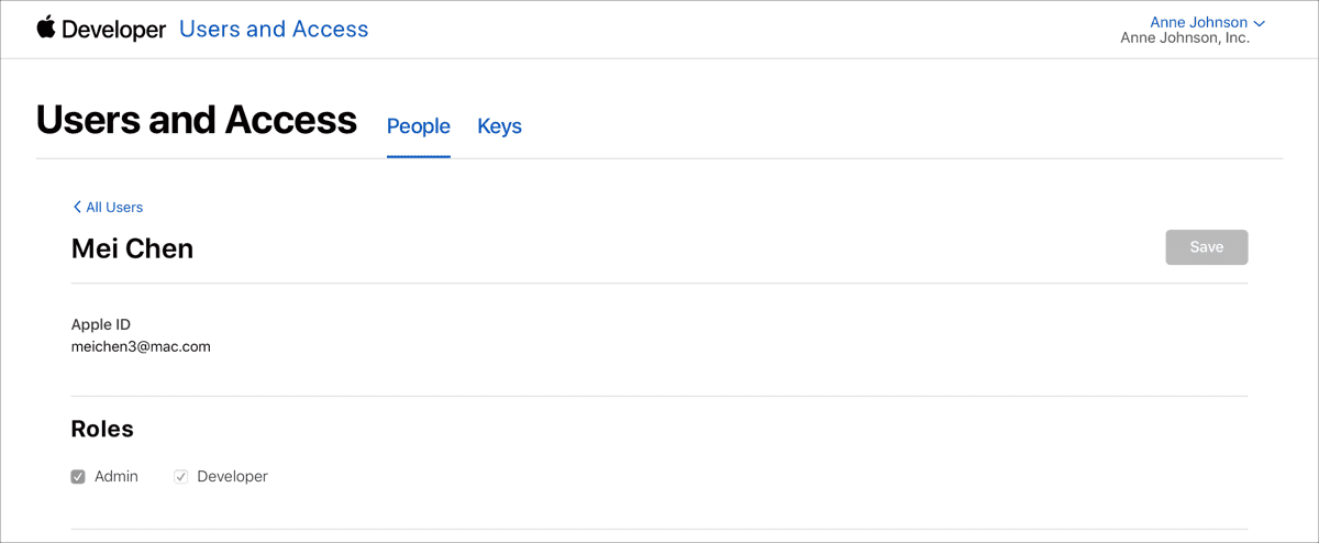 - Ajuste a função (Admin) e, quando necessário, habilite o acesso a Certificates, Identifiers & Profiles.