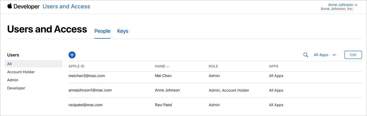 O App Store Connect foi feito para trabalhar com pessoas diferentes e permissões diferentes. O fluxo recomendado é: cada membro da equipe entra com a sua própria Conta Apple e é convidado para o time.