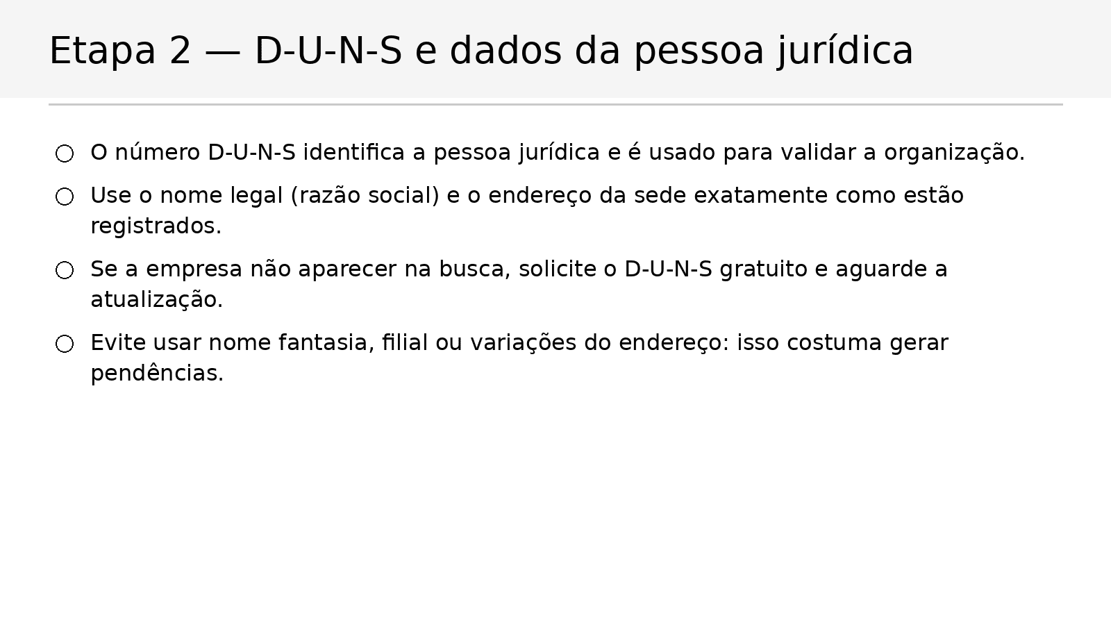 - A organização tem D‑U‑N‑S e os dados batem com a pessoa jurídica (razão social e endereço).